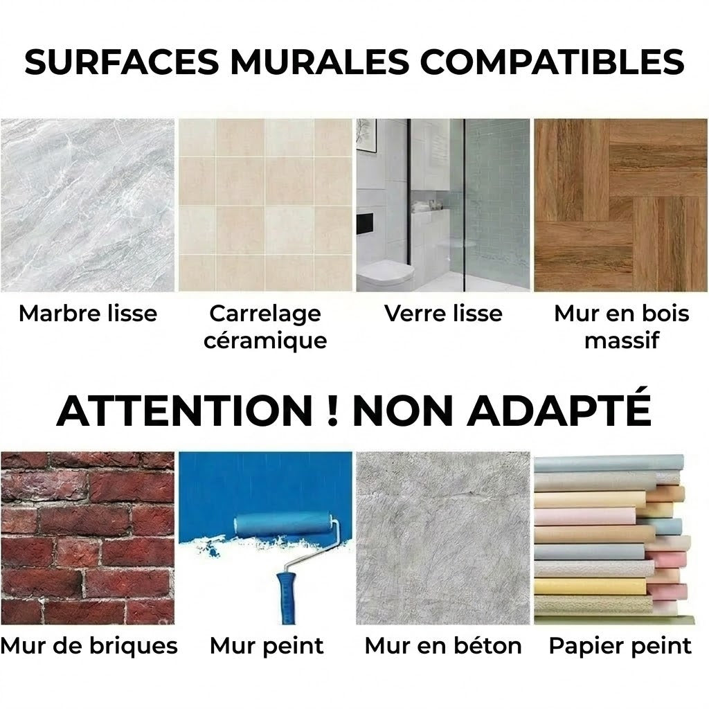 Adhérence optimale sur les surfaces lisses Ces ventouses sont conçues pour être utilisées sur des surfaces lisses et non poreuses telles que le marbre poli, les carreaux de céramique, le verre et les miroirs. Le produit n'est pas adapté aux surfaces rugueuses ou poreuses comme les murs en briques, les murs peints ou les carreaux texturés, car aucun vide stable ne peut y être formé.