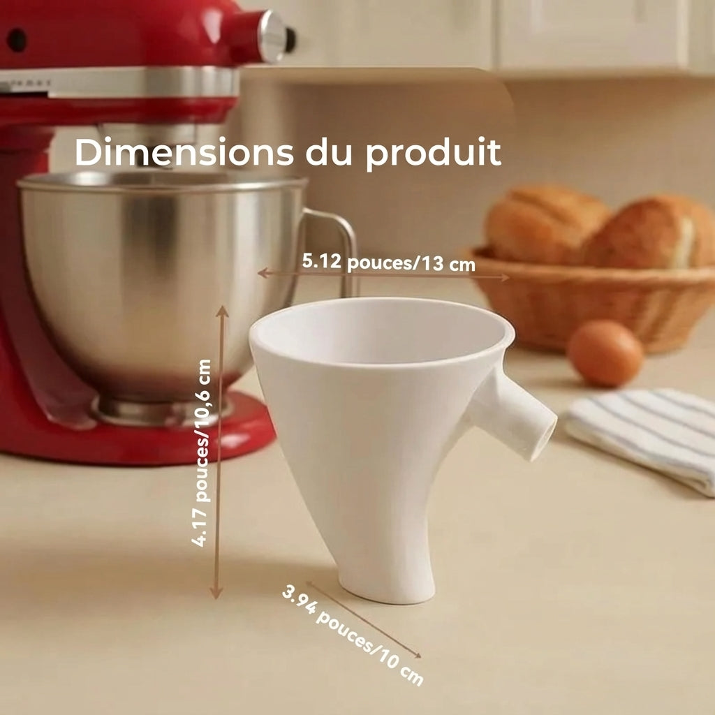 Cuisinez Sans Désordre ni Stress L'ajout de farine, de sucre ou de liquides dans votre bol mélangeur peut souvent transformer votre plan de travail et votre appareil en un champ de bataille poussiéreux ou collant. Cet entonnoir verseur intelligent résout ce problème instantanément. Il se fixe solidement au bord du bol et guide tous les ingrédients directement au cœur du mélange, vous permettant de cuisiner proprement tout en gardant votre cuisine impeccable.