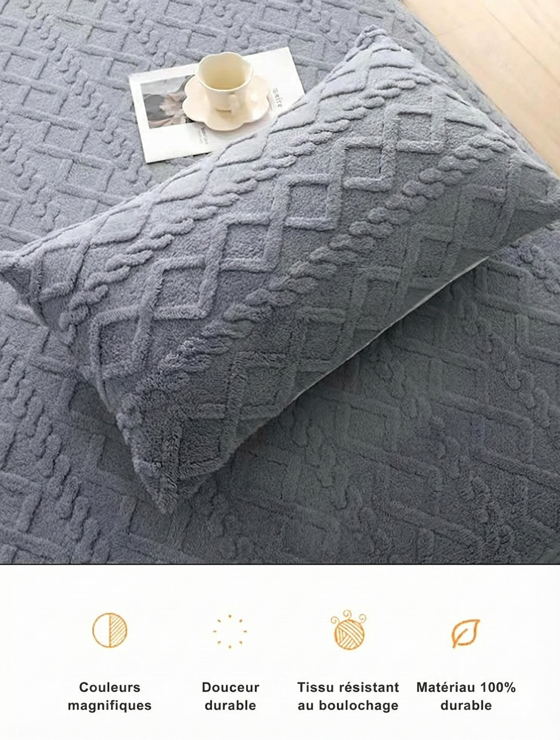 Les taies sont optionnelles. Vous pouvez les ajouter à prix avantageux via le menu de sélection. À noter : elles mesurent 48 × 74 cm, adaptées à la plupart des oreillers standard.
