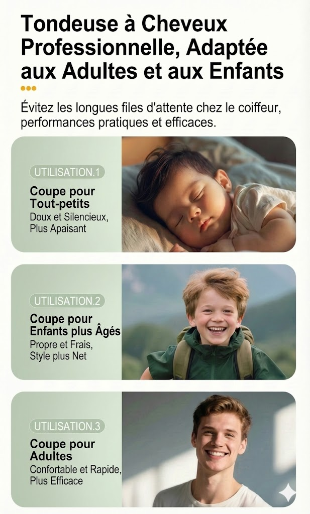 Cette tondeuse associe un moteur performant à un fonctionnement ultra-silencieux, idéal pour les enfants sensibles au bruit. La tête de coupe spécialement conçue est douce pour le cuir chevelu et réduit au minimum le risque d’égratignures. L’appareil est également très facile à nettoyer, ce qui évite toute contamination croisée et garantit une coupe sûre et hygiénique, jour après jour.