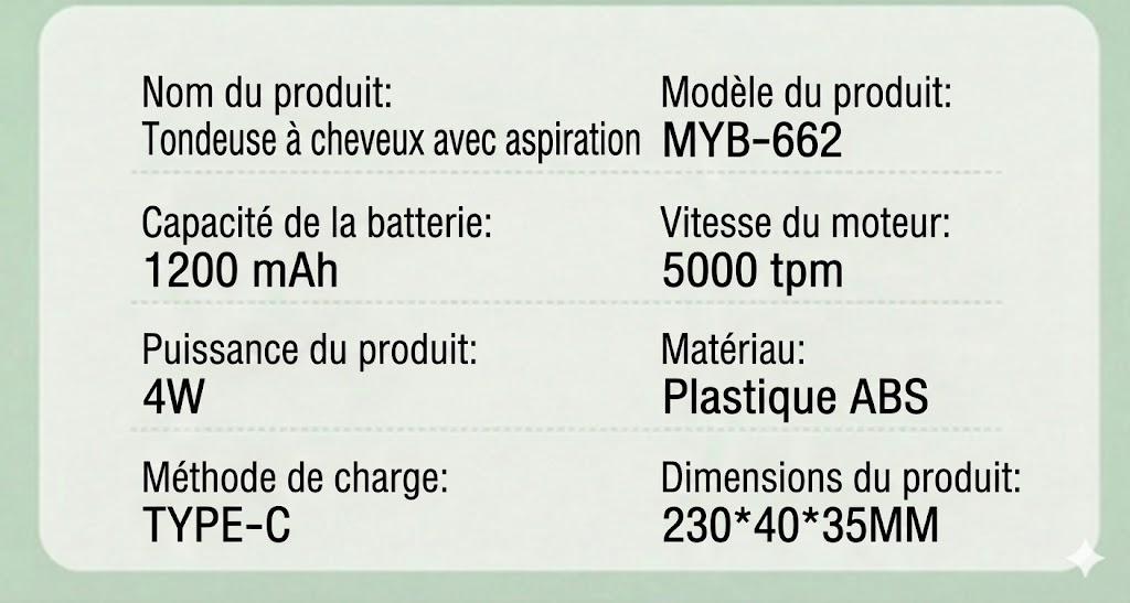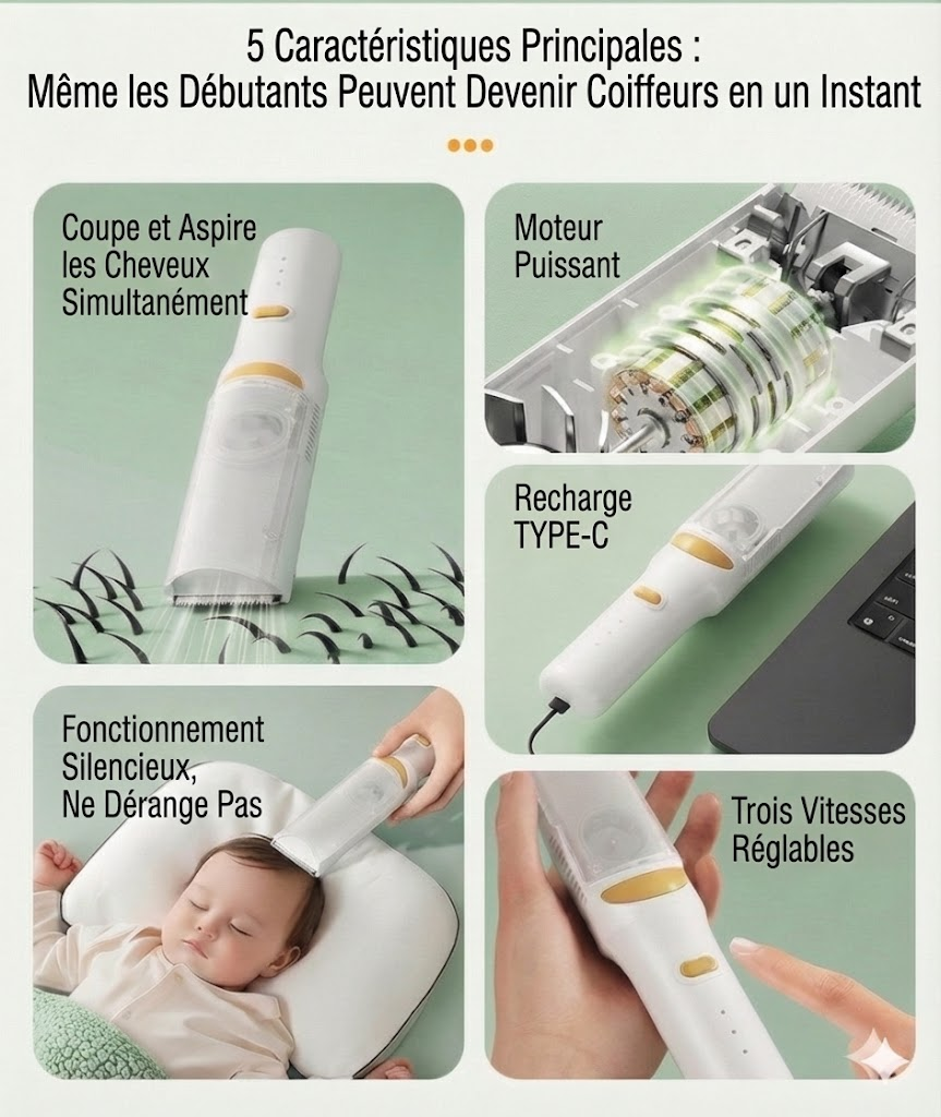 Oubliez les cheveux partout sur le sol ou les démangeaisons dans le cou. Cette tondeuse innovante équipée d’un système d’aspiration intégré aspire automatiquement les cheveux coupés grâce à un ventilateur puissant. Le résultat : une coupe propre, sans stress et sans nettoyage. Son design intuitif permet même aux débutants d’obtenir un résultat professionnel, facilement et sans complications.